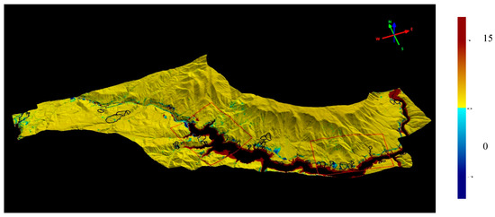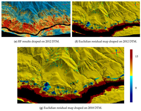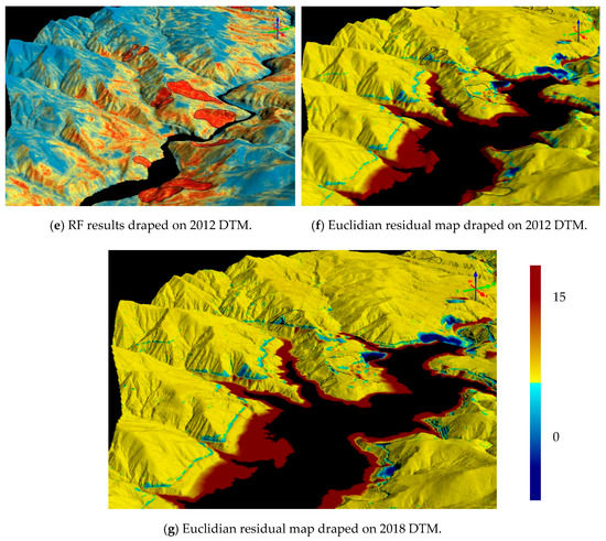 The surface comparison, as the novel part of the study, was performed between the 2012 and 2018 DTMs. The latter one was produced from the images acquired after the dam reservoir has been filled. Therefore, both construction efforts and landslides cause differences between both terrain models. The Euclidian distance residuals plot of the whole area obtained from LS3D are provided in Figure 13. The red and the blue areas in Figure 13 demonstrate the highest elevation changes. Two parts of the study area, one that comprise the road and the other one that comprise the dam construction site were analyzed visually and screenshots showing the performances of each ML and the terrain deformations are shown in Figure 14 and Figure 15. The darker blue areas in all residual plots represent landslides, although part of those are affected by the road construction. All ML methods used here detect the landslide areas, although LR and ANN methods are more conservative than the RF method as can be seen from Figure 14 and Figure 15.
