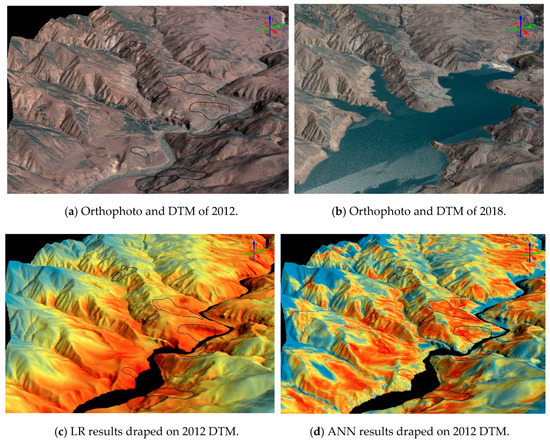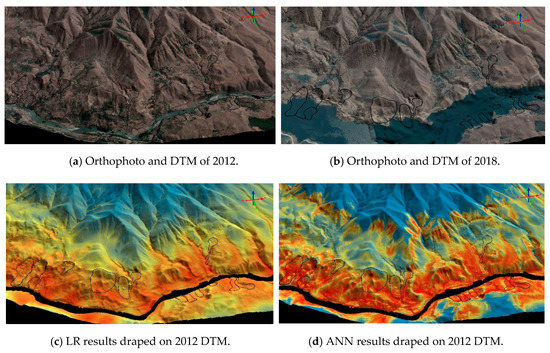 The landslide susceptibility maps and the surface comparison results between 2012 and 2018 DTMs were provided in the following sub-sections for further visual analysis. As a novel performance assessment, the resulting maps and orthophotos in some parts of the areas were draped on the DTMs in a 3D geovisualization software.