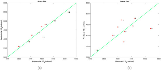 Score plot of: (a) VCO2; (b) VO2 using data from exhaled breath.