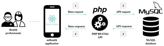 On the other hand, the MySQL RDBMS was also used to define and create the database. In this sense, SQL was the language used to manipulate and access the data stored in the database. Furthermore, to enable the communication and transfer of data between the mobile application and the database, RESTful web services were created using PHP. Therefore, the solution is divided into three distinct elements, each with a different purpose. Figure 3 illustrates the architecture and different interactions existing between the various elements of the mobile application.