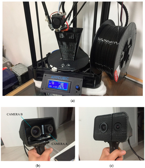 (a) 3D printing process of the prototype case; (b) cameras A and B with their placement inside the case; and (c) the final portable mobile mapping system prototype.