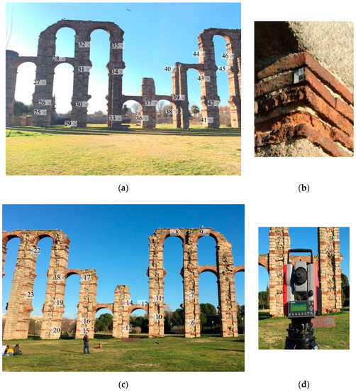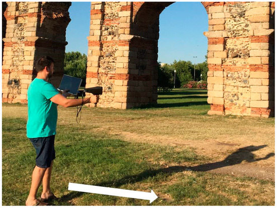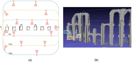 This work determined the accuracy of a set of point clouds obtained with the prototype in order to validate the device for BIM work environments. Additionally, the results were compared with a usual photogrammetric procedure, using a reflex camera and photogrammetric software (Agisoft Metashape [60]), in order to compare the advantages and disadvantages of the proposed prototype in respect to this known methodology. For this, an experimental test was carried out in the Roman aqueduct of “The Miracles” in the city of Mérida (Spain). This monument, built in the first-century A.C, has a total dimension of 12 km in length between underground and aerial sections with arches. The test was carried out on an archery stretch which was 23 m high and 60 m wide, performing a set of three data capture scenarios at different observation distances (5, 12, and 20 m) from the prototype to the base of the monument (Figure 5).