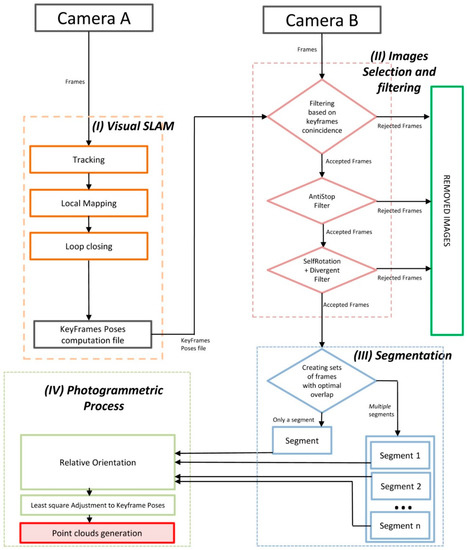 Basically, the four processes consisted in the following: (I) A VSLAM algorithm to estimate both motion and structure, that is applied in frames obtained from camera A, (II) an image selection and filtering process of frames obtained with camera B, (III) the application of an image segmentation algorithm and finally, (IV) a classical photogrammetric process applied to obtain the 3D point cloud. Each process is explained in more detail below.