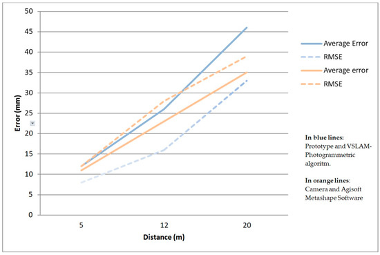 Graphic on the evolution of the average errors and RMSEs for the distances of 5, 12 and 20 m from the camera to the monument. The results are shown for both systems: Prototype and VSLAM-photogrammetric algorithm and Canon camera with Agisoft Metashape software.