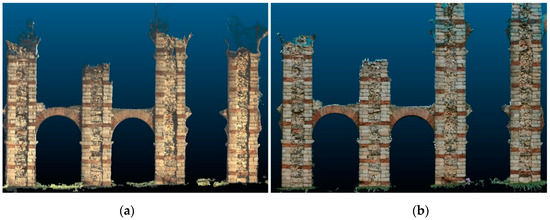Comparison between points clouds resulting from both systems (with a data capture distance of 12 m): (a) Prototype and VSLAM-photogrammetric algorithm; and (b) Canon camera EOS 1300D with Agisoft Metashape software.