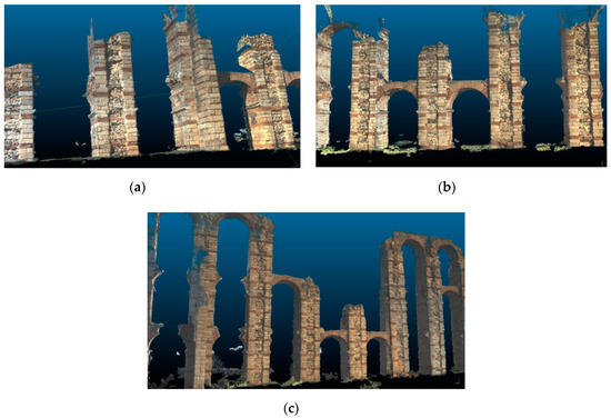 The point clouds obtained at the different distances of observation shown in Figure 9. Small holes or missing parts can be seen in those points clouds. This occurs due to the camera’s trajectory, since it needs to focus directly on all the desired areas and capture a minimum number of images to perform optimal triangulation. No filter has been applied in the results shown in Figure 9.