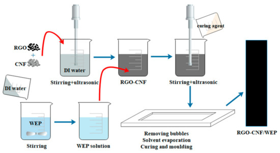 The composite was prepared by an environment-friendly solution blending and solvent evaporation method. The fabrication process is briefly shown in Figure 1. Since the WEP emulsion has high viscosity, it is not conducive to the dispersion of RGO. So, the WEP emulsion was mixed with deionized (DI) water and magnetically stirred at a speed of 1000 r/min for 5 min at first. This yielded an aqueous solution of WEP with low viscosity. Due to the hydrophobicity of RGO, it would agglomerate when added in water. Hydrophilic CNF was selected as a carrier to help the dispersion of RGO. In the second step, RGO and CNF powders were added to DI water, magnetically stirred at a speed of 2000 r/min for 5 min and then ultrasonically treated at 200 W for 30 min. Then, the obtained suspension solution of RGO-CNF was added into the WEP aqueous solution with magnetic stirring at a speed of 1000 r/min for 5 min, followed by ultrasonic dispersion at 200 W for 1 h. A solution with RGO-CNF uniformly dispersed in WEP was obtained. Then, curing agent was added at a weight ratio of 1:2. After 5 min of magnetic stirring at a speed of 1000 r/min, it was placed in the vacuum box for 30 min to remove the bubbles and subsequently put in the oven to complete curing at 40 °C for 3 h and at 60 °C for 24 h. The choice of curing temperature is key to the formation of a stable conductive network. If the temperature is high and the water evaporates too quickly, the network between graphene flakes will be destroyed, thus affecting the electrical properties of the composite. The amount of RGO in the RGO-CNF/WEP composites was 0.4%, 0.8%, 1.2%, and 1.6% by weight of WEP, respectively. The content of CNF was half that of RGO.