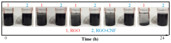 Comparison of graphene oxide (RGO) and RGO–cellulose nanofiber (CNF) aqueous suspensions with static treatment for 24 h.