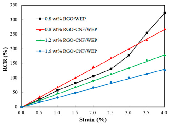Figure 5 shows the correlation between RCR and strain of four film samples. The curves indicate that the RCR has a good linear relationship with the strain in about a 10% strain range. As the strain increasing further, the RCR shows an approximately exponential growth trend. From Figure 4, it can be seen that the composites are in the elastic deformation stage when the strain is less than 4%. So, in particular, the correlation of RCR and strain within 4% the strain range is plotted in Figure 6. The curve linearity of the RGO-CNF/WEP composite is obviously better than that of the RGO/WEP composite. The slope of the curve equals the GF of the film sample, and the RGO-CNF/WEP composite is larger than the RGO/WEP composite with an RGO content of 0.8 wt%. It can be concluded that the addition of CNF can significantly improve the piezoresistive properties of the composites. The GFs of the three RGO-CNF/WEP composite samples were found to be 71, 47, and 34, respectively. They were all much larger than that of the traditional strain gauge (~2). The GF increased as the RGO content decreased. In other words, film with higher resistivity is more sensitive to strain change.