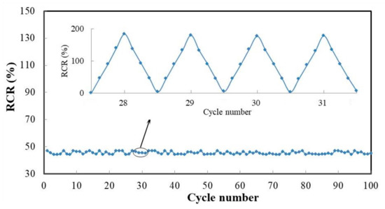 The repeated test of sample with 1.2 wt% RGO was carried out, and its GF was almost unchanged during 100 cycles of tension within the 4% strain region, as shown in Figure 7. It can be seen that the piezoresistive properties of the composite film were stable with good linearity and repeatability. The slight change in GF under cyclic tension can be explained by the low energy dissipation of sliding friction of graphene flakes [29]. The 4% strain is obviously larger than the ultimate tensile strain of concrete, which means the composite film can be used for multiple measurement of concrete strain before cracking. In addition, the GF of the composite film can be adjusted by adjusting the contents of RGO and CNF according to specific requirements, for example, when measuring low strain to adjust to high sensitivity and high strain to low sensitivity [33].
