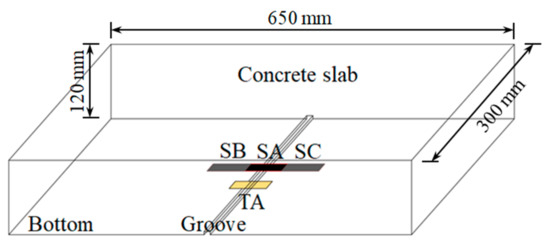 Due to the low tensile strength, concrete is easy to crack in the tension zone. A traditional resistance strain gauge can only measure the strain of concrete before cracking because of its small measuring range and cannot monitor the situation after cracking. The above analysis shows that the composite film has excellent piezoresistive properties and can withstand large deformations, so it may be used to monitor concrete cracks. A multi-electrode film sensor was fabricated as shown in Figure 8a. The composite film was divided into three test sections, SA, SB, and SC, by four electrode tabs. The electrode tabs were made of copper foil and embedded in the film. In order to verify the sensing properties of the composite film to concrete strain and crack, a concrete slab with a size of 650 mm × 300 mm × 120 mm was poured. The slab was equipped with a small amount of reinforcement so that it could continue to bear load after concrete cracking. The multi-electrode film sensor was bonded to the slab by structural adhesive. As shown in Figure 9, the middle section of the film sensor was located in the middle of the bottom of the slab, where a groove with a width of 2 mm and a depth of 5 mm was reserved for the crack to first appear, and a traditional resistance strain gauge (TA, as shown in Figure 8b) was pasted parallel to SA. Figure 10 shows the layout of the experimental setup. The load was applied by a hydraulic jack (YZF500, Haili Machinery Manufacturing Co., Ltd., Taizhou, China) through a reaction frame, and four-point loading was used. The strains of SA, SB, SC, and TA were collected using a static resistance strain indicator (UT7121Y, Youtai Electronic Technology Co., Ltd., Wuhan, China). The resistances of SA, SB, and SC were measured using a 6.5-digit source meter (DMM6500, Keithley Instruments, Cleveland, OH, USA).