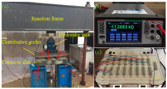 Layout of the experimental setup: (a) four-point loading chart; (b) source meter; (c) static resistance strain indicator.