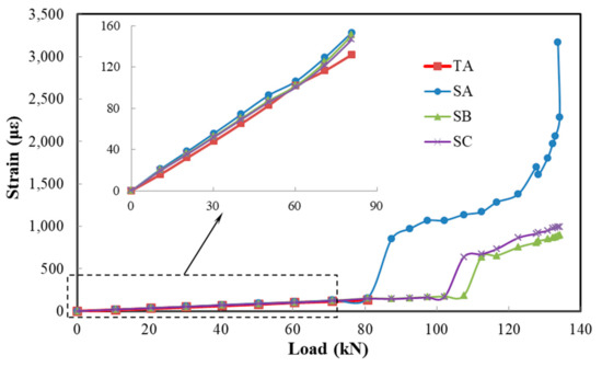 Figure 11 shows the strains of SA, SB, SC, and TA during loading. As the load increases, the strain of concrete in tension zone increases gradually. When the load reaches 80.7 kN, the strain of TA is 132 microstrains. This means that the average strain of concrete in the length range of TA is also 132 microstrains. When the load reaches 87.5 kN, TA loses its signal, but the strain value of SA changes abruptly. Observations of the concrete near SA and TA show that a crack appears. Although the average strain of concrete at this time is much less than the ultimate tensile strain of TA (20,000 microstrains), the strain of the concrete in the local area near the crack exceeds the ultimate tensile strain of TA. So, TA is broken and does not work after the load of 87.5 kN. However, SA can still work because of the good deformability of the composite film. As the load increases, the strain value of SA continues to increase. Before the concrete cracks, the measured strain of SA is close to that of TA, which indicates the feasibility and accuracy of measuring the concrete strain using the composite film. There is also a slight difference between both. This can be attributed to the following three possible reasons: (i) the flatness of the slab bottom may be insufficient, and bubbles would be introduced when sensors are not pasted well, affecting the monitoring results, (ii) the composite film is much thicker than the traditional resistance strain gauge, which makes the strain transfer different, and (iii) the Poisson’s ratio differs between the composite material and concrete. This results in the GF of the isolated composite film measured by stretching having a tiny difference to the actual GF when bonded to concrete. In addition, SA, SB and SC are all in a pure bending section, but the strain of SA is a little larger than the strain of SB and SC before the concrete cracks. This is because that the groove decreases the inertial moment of the middle section. After concrete cracking, the traditional resistance strain gauge is damaged, while the composite film can still monitor the signal. Subsequently, the SB and SC strains also increase abruptly, and cracks occur at the corresponding locations. However, if the strain after concrete cracking exceeds 4%, the measured strain is not the actual value. This is due to the large strain of the film after cracking, which results in a great change in the GF of the film, but the initial input of GF is constant. In practical applications, it is necessary to modify the monitoring value after cracking.
