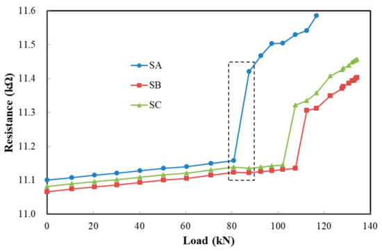 The resistance changes in SA, SB, and SC during loading.