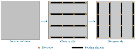 For some complex structures, it is sometimes necessary to monitor the deformation, especially cracks, in larger areas. However, the monitoring area of a rectangular composite film sensor (RCFS) is quite limited, and it is not economical and convenient to use multiple RCFSs for regional monitoring. The composite inherits the good plasticity of WEP. By using the screen-printing technique, multiple RCFSs can be integrated into a thin film, and a composite mesh film sensor (CMFS) is designed, as shown in Figure 13. Transverse sensing elements are printed on one side of a polymer film, longitudinal sensing elements are printed on the other side, and then two protective films are covered on both sides. According to the position of the sensing element (SE) with abrupt resistance change, the position of the crack is preliminarily determined. Further, if the midpoint coordinate of the SE is taken as the coordinate of the crack at this position, a series of points can be attained with the development of the crack. Then, the approximate trend of the crack can be obtained by multi-point fitting, and its accuracy may be related to the distribution density of the SE. The width of crack can also be obtained by Equation (2).