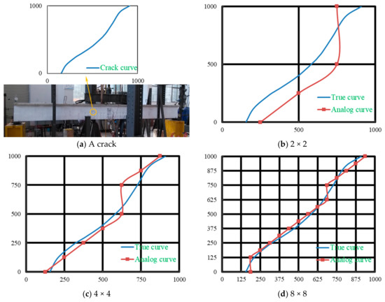 Figure 14a shows a crack on the surface of a concrete beam caused by fatigue load. If the crack area was monitored using CMFS before the crack occurred, crack trend may be obtained by the above method. Figure 14b–d shows simple simulation results of the crack trends monitoring using CMFSs with different SE distribution densities. It can be seen that the larger the distribution density is, the closer the analog curve is to the true curve. It is noteworthy that this applies only to the case in which there is only one crack in the monitoring area, and further discussion is needed when multiple cracks occur. The thickness of the film can be very small. When it is inconvenient to further improve the distribution density of SE, the multi-layer composite mesh film can be used to improve the monitoring accuracy. In addition, epoxy is often used as a reinforcement material. The composite prepared in this paper may be used as a reinforcement material, and at the same time, the structural performance after reinforcement can be monitored.
