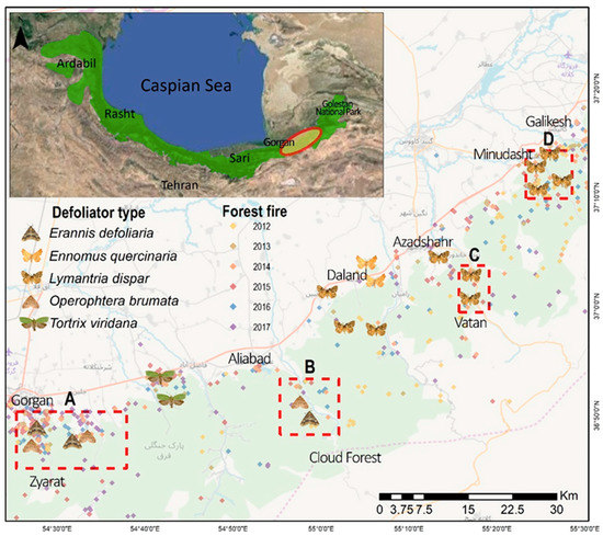 - Kia-Daliri, H.; Kazemi-Najafi, S.; Ahangaran, Y. The effect of leaf feeder moth (Erannis defoliaria & Operophtera brumata) on radial growth of 3 tree species in north of Iran (case study: Mashalak, Nowshahr). Iran. J. For. Poplar Res. 2007, 15, 301–309. [Google Scholar]