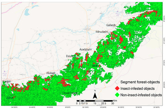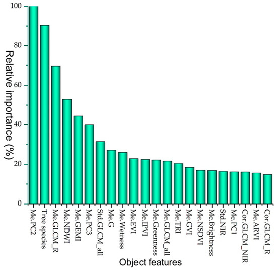 - Although the object features of Landsat 8 OLI recorded a higher importance for discriminating insect-defoliated objects, tree species has obtained the second rank of importance following the mean of PC2. In addition, other top image object features were the mean of the red channels derived from GLCM, the mean of NDWI, and the mean of GEMI, respectively.