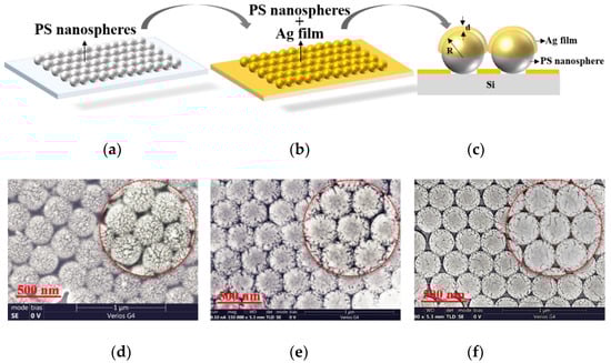 (a–c) Sketch map of the fabrication process of the Ag-film semi-coated PS nanosphere array; (d–f) SEM image of the Ag-film semi-coated PS nanosphere array with an Ag film thickness of d = 10 nm (d), 20 nm (e), and 30 nm (f), respectively.