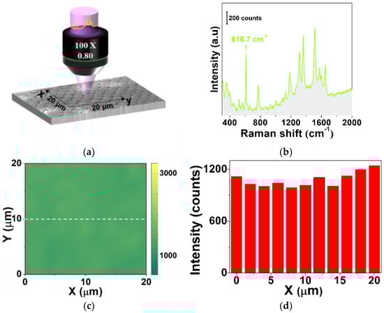 To examine the uniformity of the SERS substrate with an Ag film thickness of d = 10 nm, Raman mapping was performed using a home-built Raman mapping system under excitation of a focused Gaussian beam. A square region of 20 × 20 μm, as shown in Figure 5a, was scanned with a step value of 500 nm. R6G with a solution of 10−5 M was absorbed on the surface of the SERS substrate. The intensity of the Raman characteristic peak at 610.7 cm−1, as shown in Figure 5b, was used to reconstruct the image of the Raman mapping. Figure 5c is the Raman mapping result reconstituted with the peak of 610.7 cm−1. Furthermore, a line scan of the Raman mapping was taken along the white curve in Figure 5c, as denoted by the histogram result in Figure 5d. The relative standard deviation (RSD) was calculated as RSD = 7.91%. The result indicates that the SERS substrate with d = 10 nm has a high uniformity.