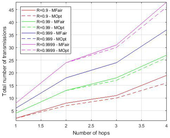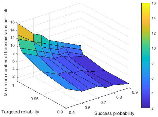 If there is a link j that provides a reliability , then the product of the reliability of all other links should be greater than 1 to obtain an end-to-end reliability of R, which is impossible. Therefore, each link has to provide a reliability at least equal to R by means of retransmissions. Since the reliability of a link j increases with the maximum number of transmissions according to Equation (1), to obtain an end-to-end reliability of R, the number of transmissions should be greater than or equal to that needed to obtain a link reliability of R, leading to □