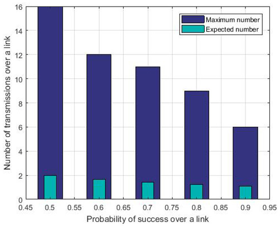 Figure 2 depicts the maximum and the expected numbers of transmissions per message of a 4-hop flow, for a targeted end-to-end reliability of , over a link whose success probability per transmission ranges from to . We observed that, in all the cases studied, although the value of decreases when , the success probability per transmission increases, remains constant and equal to 2. By stopping its retransmissions as soon it receives an acknowledgment, the sender saves its energy. For instance, let us consider that for any link j for which is visited by a 4-hop flow, the sender saves transmissions for this link that is transmissions for . Since the flow visits four hops and assuming that its four links have the same success probability, each of the four transmitting nodes saves 14 transmissions. Assuming that the schedule is periodic with a period of 101 time slots (the default value in the TSCH network), and this flow generates a message per schedule period, these four nodes save 140 ms each schedule period of ms, for a slot duration of ms. This corresponds to an increase of in sleeping time per schedule period for each node.