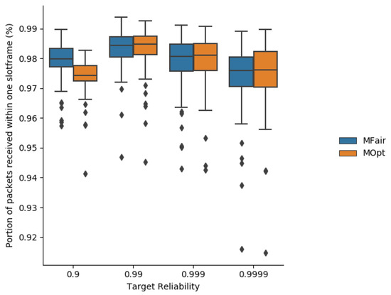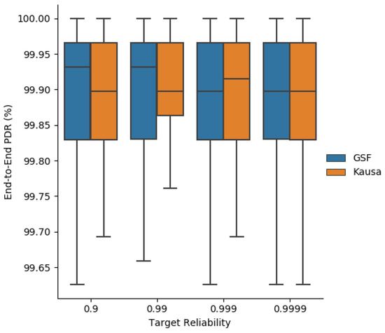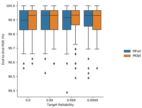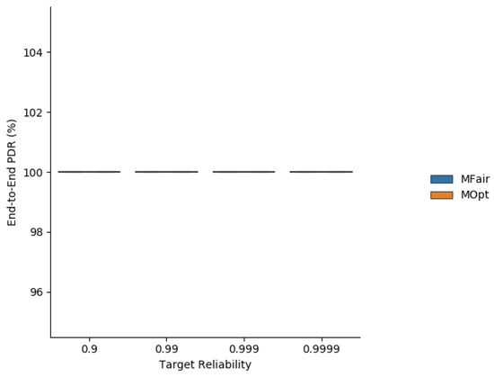 With regard to the end-to-end PDR, we observe in Figure 18 that both and ensure a PDR greater than the targeted one when it belongs to the interval [0.9, 0.999]. For greater values, the PDR is not met because the value of is too small to reach the targeted end-to-end reliability. In addition, tends to provide a greater median value than .