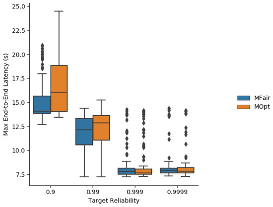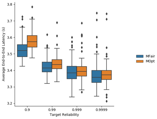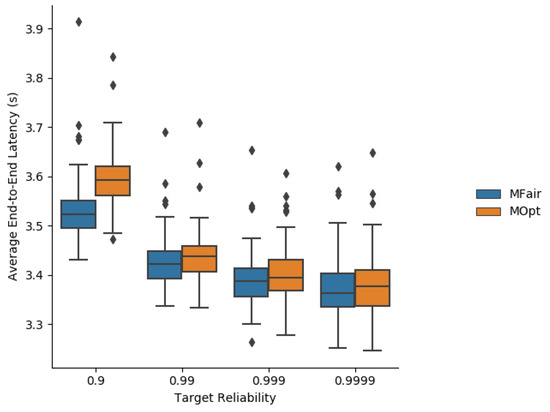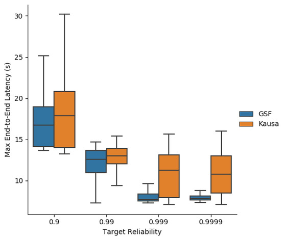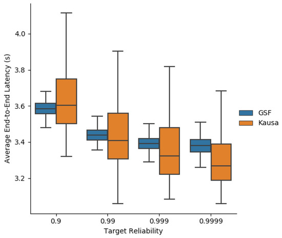 Figure 16 depicts the average end-to-end latency obtained by and . They both provide close values. However, provides a much smaller variance of the average end-to-end latency than , making it more predictable, even for high targeted reliabilities.