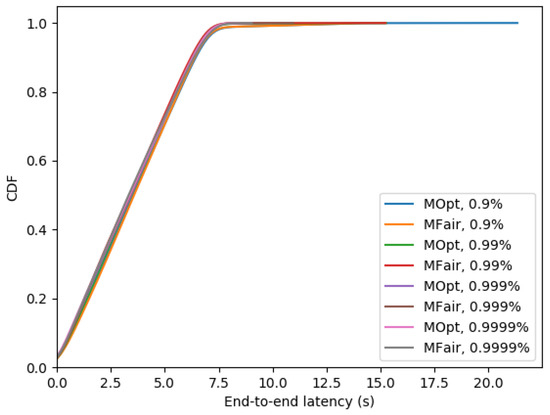 Figure 10 depicts the cumulative distribution function of the end-to-end latency for and . With , 98% of messages reach the sink in one slotframe that is with an end-to-end latency ≤7 s. The gap between and is smaller than .