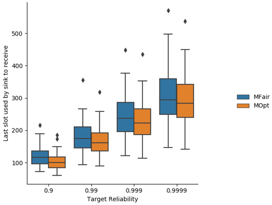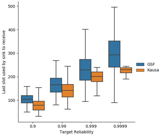 The maximum end-to-end latency obtained by simulation with and is illustrated in Figure 11. Since allocates more TX cells and the slotframe size is kept identical for and , provides a shorter maximum end-to-end latency. For targeted reliabilities ≥0.999, and provide very close maximum latencies.