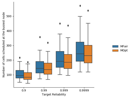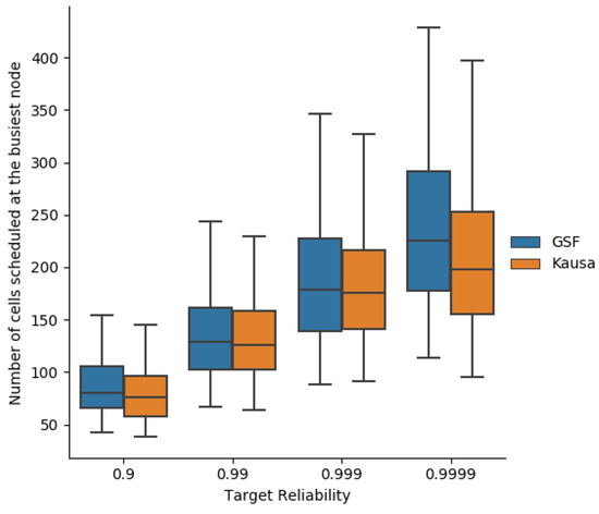 Figure 13 depicts the number of cells assigned to the busiest node in one simulation run for each targeted end-to-end reliability.