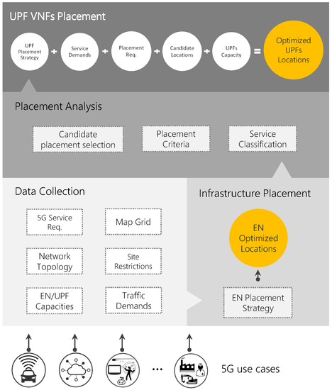 By placing the UPFs at the network edge not only the network response time but also the bandwidth consumption can be significantly reduced. However, placing a UPF in every available EN results in a rise of costs and UPF relocations. Therefore, the main objective of the UPF placement stages is to determine the optimal number of UPFs and their location in the given EN infrastructure, so that 5G services requirements can be satisfied while costs are minimized. Please note that, unlike the ENPP, where the access nodes can be simplified as TGs, the UPFs placement is strongly dependant on the behaviour of their underlying end-users (e.g., service demand and mobility patterns).