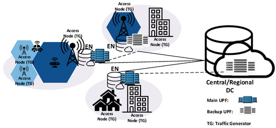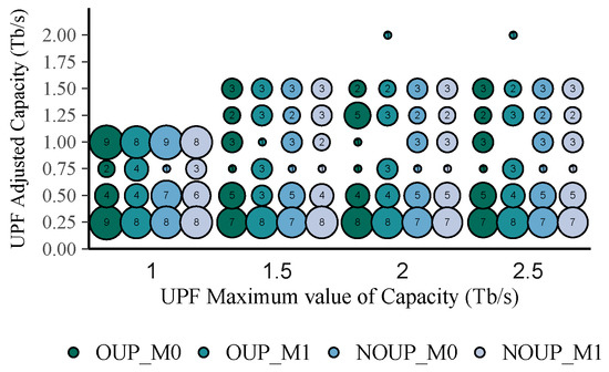 The constraint (6) guarantees that the demands of an access node are served by only a main UPF at a given time. In addition, restriction (7) forces the assignment of the access nodes to at least the minimum number of backup UPFs (−1) necessary to satisfy the service reliability requirements. Thus, each access node will be assigned to a total of UPFs (i.e., one main UPF and −1 backup UPFs). Additionally, Inequalities (8) and (9) ensure that the capacity of the main and backup UPFs is not exceeded by the underlying service demand. The factor defines the maximum capacity to be occupied in the main UPFs by the access nodes to avoid slowing their performance.