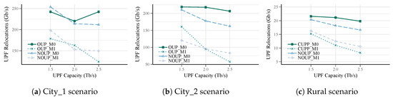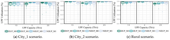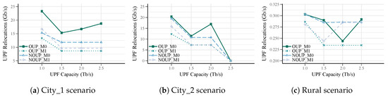 Algorithm 3 is executed (line: 28) after a level of UPFs is placed. Its main objective is to reduce the number of UPFs and the relocation occurrence if mobility requirements are considered. Hence, Algorithm 3 first step is to determine the overall available capacity () in the UPFs of the level (line: 1). This capacity is compared with the UPF maximum capacity (line: 2). If the overall available capacity is higher than the UPF maximum capacity, the number of UPFs could be reduced (by removing some of them). To delete the lowest utilized UPFs, they are sorted and analyzed in descending order according to their available capacity (line: 3). For each UPF at level , it is checked whether all its assigned access nodes can be served by other UPFs (lines: 5–12). If an access node can be reassigned to other UPF, this is indicated by marking the access node (lines: 7–8). If all the access nodes in a UPF service area can be served by other UPFs, they are reassigned and the UPF is deleted from the set of UPFs (lines: 9–11). As a result of this process, the set of UPFs at level , their service areas, the available candidates and the candidate locations for each access node are updated (line: 12).