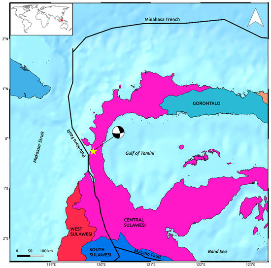 In the proximity of the island, the northward moving Australian plate and the westward moving Philippine plate subduct under the Sunda plate with rates of the order of 5–10 cm/year [6,7]. Such relative motion between plates generates crustal block rotations and transpressive faulting zones with several active structures crossing Sulawesi Island. One of those, the left-lateral NNW–SSE trending Palu-Koro strike-slip fault, cuts Palu Bay through the northeastern part of the island and is responsible for the Mw 7.5 seismic event occurred in the western part of Central Sulawesi.
