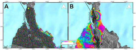 Wrapped interferogram retrieved by Sentinel-1 (A) and ALOS-2 (B) data. Each color cycle represents a LoS displacement equal to λ/2. The figure highlights the unsuitability of C-band sensors to capture high spatial rates of deformation as in the case of the Sulawesi earthquake. Solid lines are the main tectonic structures crossing the island retrieved by the GEM Global Active Faults project [16]. The dashed line is the unmapped segment of the Palu-Koro fault that ruptured during the seismic event. The yellow star indicates the epicenter of the Mw 7.5 2018 Sulawesi earthquake occurred on the western part of Central Sulawesi district.