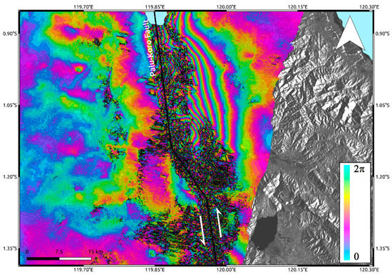 We think that in this particular case, InSAR data are not completely reliable for providing a clear indication of the surface fracturing and to retrieve information about the causative fault. Rather they can give a qualitative evaluation of the deformation pattern to integrate with other source of data for supporting the study of kinematic and speed of rupture propagation of the Mw 7.5 Sulawesi earthquake [12,20,21].