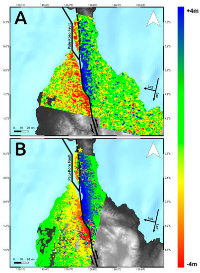 Unfortunately, the wide surface displacement due to the Mw 7.5 Sulawesi earthquake produced strong ambiguity problems in InSAR results. This is because InSAR products consist of wrapped phase maps where every phase color cycle (2π), also called interferometric fringe, represents a deformation equal to half wavelength of the sensor working frequency, measured in the Line of Sight (LoS) of the sensor itself. Therefore, if a deformation phenomenon is very impressive, it could not be possible to recognize and discriminate the interferometric fringes thus leading to a signal loss. Indeed, although we applied very strong Goldstein filtering [19], this technique is not able to recover signal especially in the proximity of the fault rupture, i.e., where the deformation reaches its peak. This is particularly evident for Sentinel-1 data (Figure 2A), since half wavelength at C-band corresponds to ~2.83 cm. In addition, C-band is also more sensitive to temporal decorrelation effects induced by large vegetated areas surrounding the urban area of Palu. On the other hand, because of the larger half wavelength, i.e., ~12 cm, L-band ALOS-2 data are less sensitive to both phase ambiguity problems and temporal decorrelation effects. Accordingly, L-band interferogram (Figure 2B) shows some interferometric fringes starting from about 6 km far from the Palu-Koro fault trace representing a LoS deformation of more than 60 cm. However, they also do not allow retrieving any information about the near deformation field as clearly observable in Figure 3. Moreover, the retrieved LoS displacement values largely under-estimate the real deformation since most of the displacement occurred along N–S direction, according to the NNW–SSE strike-slip Palu-Koro faulting mechanism, that is the path to which InSAR is less sensitive.