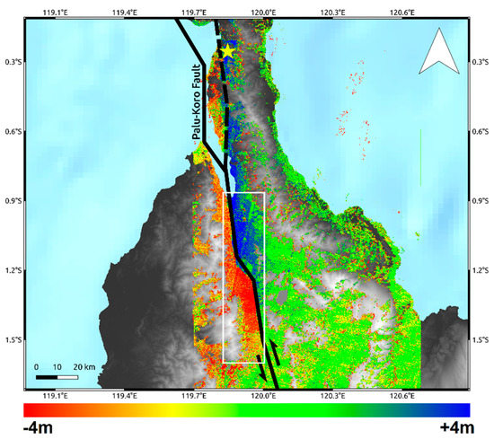 N–S displacement retrieved by C-band Sentinel-2 data. Solid lines are the main tectonic structures crossing the island retrieved by the GEM Global Active Faults project [16]. The dashed line is the unmapped segment of the Palu-Koro fault that ruptured during the seismic event. The yellow star represents the epicenter of the Mw 7.5 earthquake. The background image is the DEM provided by SRTM mission [17]. The white rectangle is used to carry out the zonal statistics in Table 1.