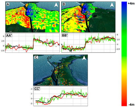 Data profiles showing ground deformations by Sentinel-1 (red), ALOS-2 (black), and Sentinel-2 (green) along AA’, BB’, and CC’ transects. The background maps are the displacement fields retrieved by Sentinel-1 (A), ALOS-2 (B), and Sentinel-2 (C) data.