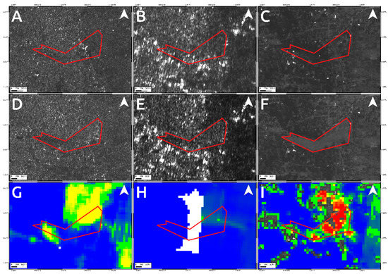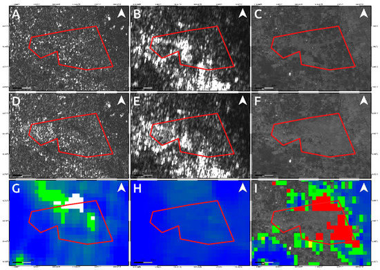 Data comparison for detecting the landslides activated by the Mw 7.5 2018 Sulawesi earthquake close to the Palu airport. Upper panels show the pre-seismic image for Sentinel-1 (A), ALOS-2 (B) and Sentinel-2 (C) data. The central panels refer to the Sentinel-1 (D) ALOS-2 (E) and Sentinel-2 (F) post-seismic images whereas the bottom ones show the products of data processing technique applied on Sentinel-1 (G), ALOS-2 (H) and Sentinel-2 (I) data. The red polygon represents the affected area (see Figure 10).