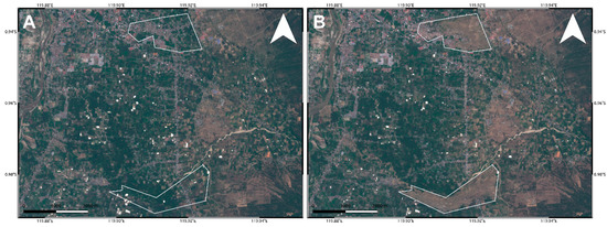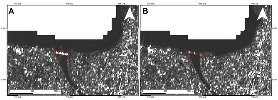 Regarding the damages along the coastal area of Palu bay, SAR intensity seems to be more appropriate for identifying the Palu IV bridge collapse. This is due to the different backscattering values of SAR signal reflected by the bridge and the surrounding water. Before the collapse, the bridge is represented by a “stripe” of very bright targets clearly distinguishable with respect to the low intensity of the surrounded water (Figure 11A). Obviously, after the collapse of the bridge in the water (see Figure 7) such different behavior is no longer defined (Figure 11B). Optical data are not so sensitive to such phenomenon although they show very well the consequences of the seismic-induced events such as tsunamis, soil liquefaction, and coastal landslides, i.e., a significant coastal retreat and the disappearance of the small island below the bridge (Figure 12). They are also shown in SAR data but are less emphasized because of speckle noise and the coarser resolution with respect to optical data (~15 m vs. ~10 m) (Figure 11).