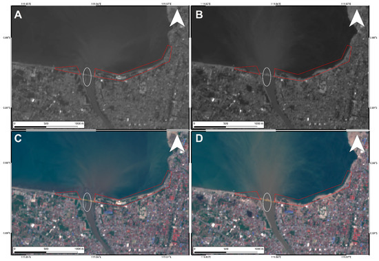 Pre- (A,C) and post-seismic (B,D) Sentinel-2 optical images. The coastline retreat is clearly visible in red polygons. The white ellipse indicates the small island at the river mouth completely disappeared in the post-seismic images.