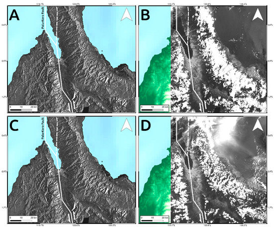 Comparison between Sentinel-1 SAR (A,C) data and Sentinel-2 optical intensity images (B,D). Pre- (A,B) and post-event (C,D) images. Solid lines are the main tectonic structures crossing the island retrieved by the GEM Global Active Faults project [16]. The dashed line is the unmapped segment of the Palu-Koro fault that ruptured during the seismic event.