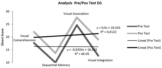 The Illinois Test for Psycholinguistic Aptitudes (ITPA) was used to evaluate the psycholinguistic functions involved in the communication process and establish variables to determine the degree of disorder in various areas of learning. It is composed of 12 sub-tests organized into categories [60]. As we mentioned in the Introduction section, four sub-tests were selected: visual comprehension, visual association, visual integration, and visual-motor sequential memory.
