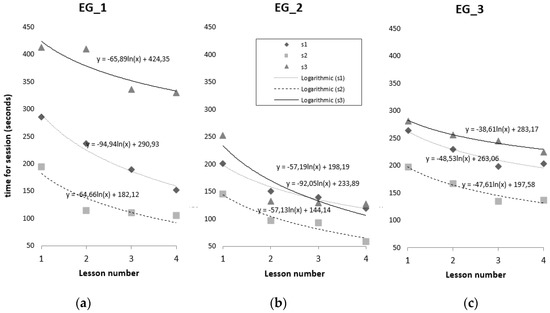 The behavior of the ‘errors made during the stimulation’ variable has a curve whose behavior is similar to that of the ‘time’ variable; that is, its value decreases with every stimulation lesson. The variation in the errors made between the first and second lessons is larger than it was for the time variable, with the exception of session 1 in EG_1, which remains constant during the four lessons (y = 2). The average difference between the first and last lessons for each individual is: EG_1 = 101 s; EG_2 = 98 s; EG_3 = 59 s. In every case, this difference is higher in the exercises proposed in session1, on visual association.
