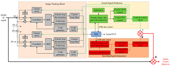In this paper, we use vector-tracking architecture to implement the spoofing attack. From the aspect of demodulating the actual signals, the vector-tracking SDR can track the actual code and carrier much more accurate and robust in urban environments. From the aspect of modulating the spoofing signal, the vector-tracking has the function of converting the predicted receiver position and velocity to the corresponding code frequency and carrier frequency. The detailed implementation architecture is shown in Figure 2. It includes three blocks: tracking channel, actual signal prediction, and spoofing signal generation. All these three blocks are connected with an extended Kalman filter (EKF).