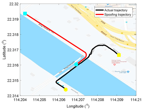 The spoofing trajectory was designed on the Google map and also plotted in the same figure as the red line. It is better to use actual roads to generate the spoofing trajectory to meet the physical road constraints of the navigation map in autonomous vehicles. It is easy to connect the spoofing trajectory with the actual trajectory at intersections. As shown in the figure, the spoofing attack was launched from the end of the bridge and aimed to guide the automobile to the Shing Cheong Road, which is parallel to the actual test road but turn to northwest at the end of the bridge. The spoofing attack was launched from the 70th second.