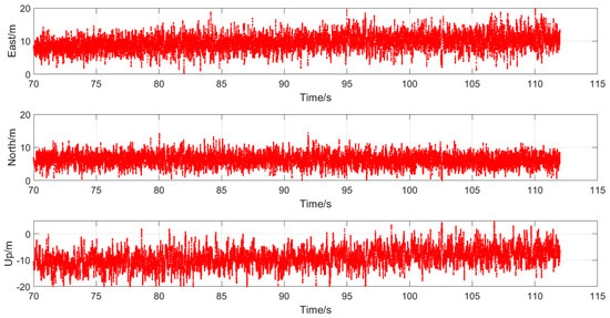 It is within expectations that the victim receiver was spoofed off its actual trajectory successfully and turned to the Shing Cheong Road at the end of bridge. Then, it kept on working with the established trajectory. What needs to be explained is that the positioning errors under the actual signal in the last half part became bigger due to the interference caused by buildings around the hospital, while the positioning errors under the spoofing signal were small and stable thanks to a relatively open sky along the coast. It is also worth remembering that the spoofing signal generation should consider the impact of surrounding buildings to keep its fidelity, which is considered in our future work. The positioning errors related to the spoofing trajectory are also given in Figure 8, which are given in East–North–Up (ENU) coordinates. The positioning errors are defined as the differences of positioning results and the spoofing trajectory.
