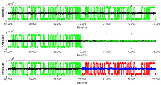 To evaluate the performance of spoofing signal further, the tracking results at the transition moment are analyzed in this subsection. Three scenarios are considered in this analysis: (1) actual signal tracking, in which no attack exists; (2) attack with only actual signal cancellation, in which the attack signal only includes the predicted actual signal component; (3) attack with spoofing signal modulated, in which the attack signal not only includes the predicted actual component, but is also combined with the generated spoofing signal component. The tracking results lasted 6 s, including 3 s before spoofing and 3 s after spoofing. The transition point was the 70th second. Figure 9, Figure 10, and Figure 11, respectively, show the outputs of prompt branch, delay lock loop (DLL) discriminator, and phase lock loop (PLL) discriminator in tracking. In every figure, the above three scenarios are presented from top to bottom. Particularly, in the 3rd scenario, the results before and after spoofing are plotted in different colors.